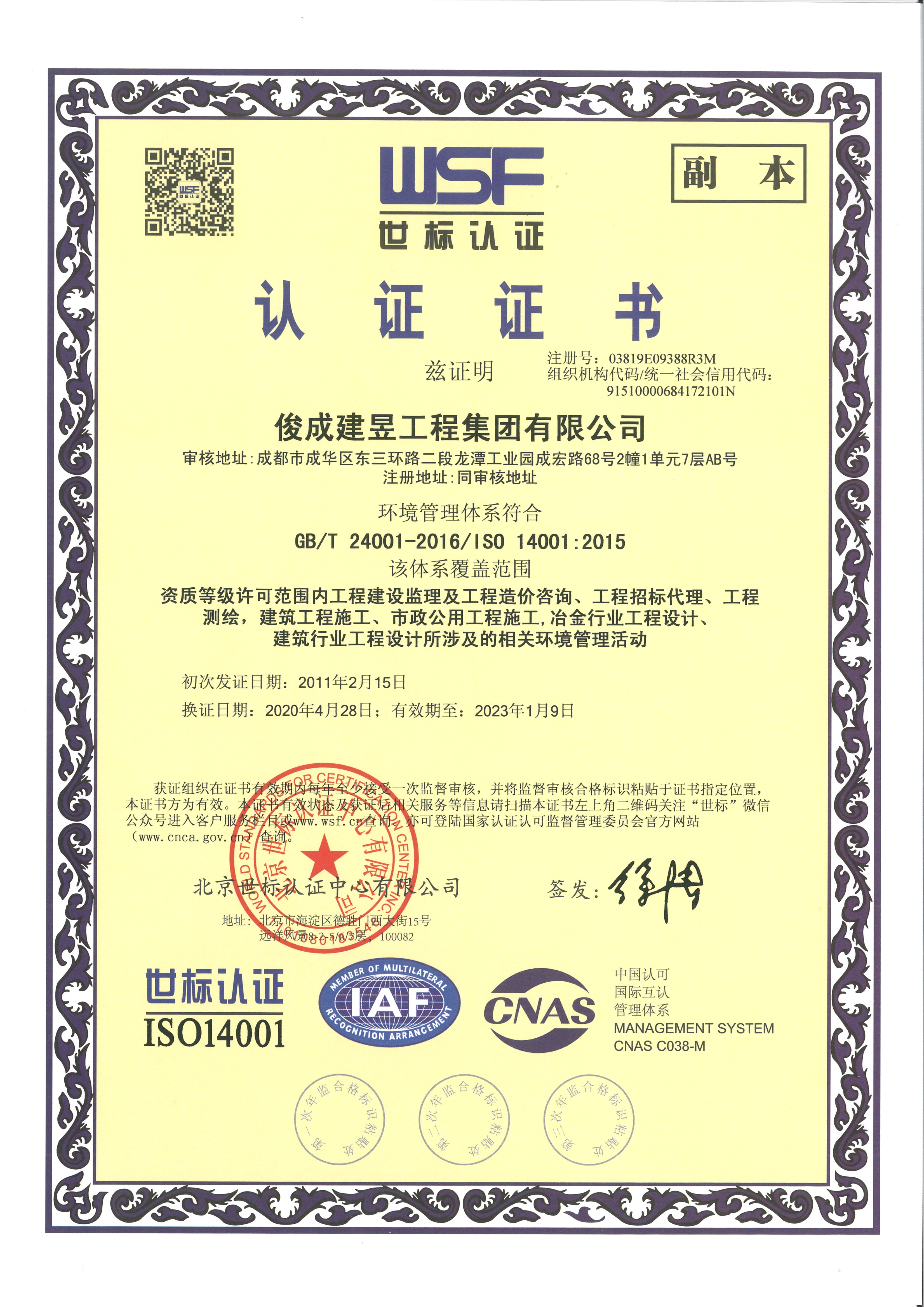 俊成建昱工程集團有限公司通過ISO年審